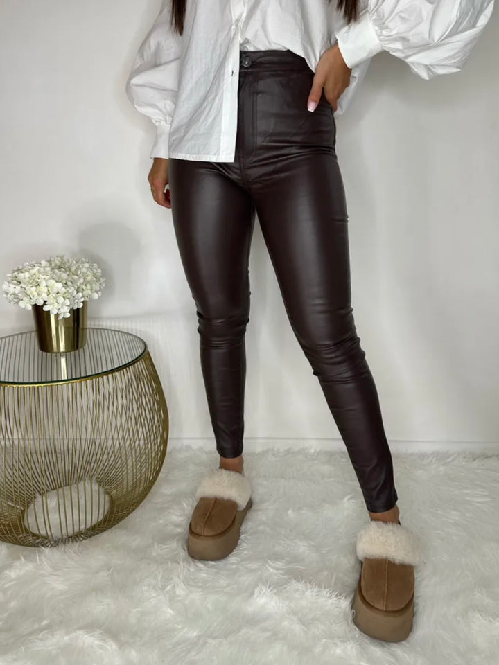 Stretchy leather look pants. Comfy and trendy! Combine it with your favorite top or sweater and you are ready to go. High waist, 5-pockets and belt loop.