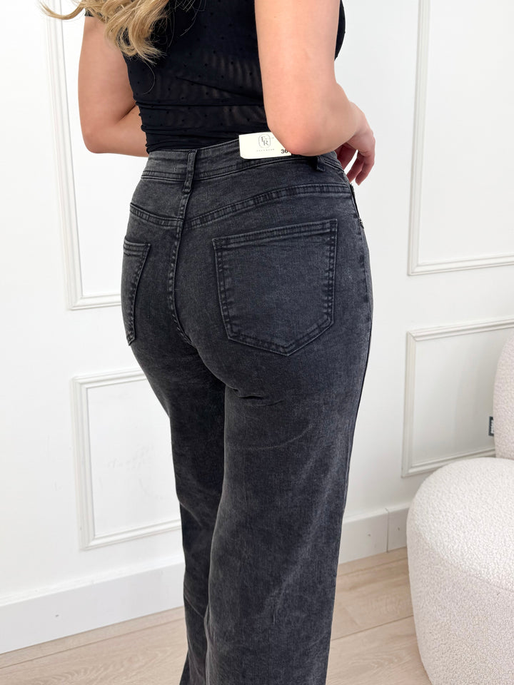 De wide leg jeans heeft een high waist model en bevat steekzakken aan de voor- en achterzijde. De jeans wordt gesloten door middel van een rits- en knoopsluiting en bevat stretch.